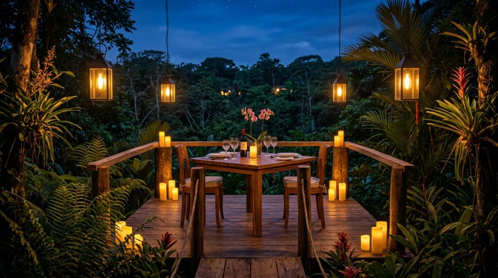 Unser absoluter Geheimtipp: das „Sunset Canopy Dinner“ – ein Dinner in den Baumwipfeln während der goldenen Stunde. Viele Anbieter kombinieren dies mit privater Wildtierbeobachtung. Dein Guide zeigt dir versteckte Affen, Vögel und mit etwas Glück sogar einen scheuen Ocelot, bevor das Dinner beginnt.